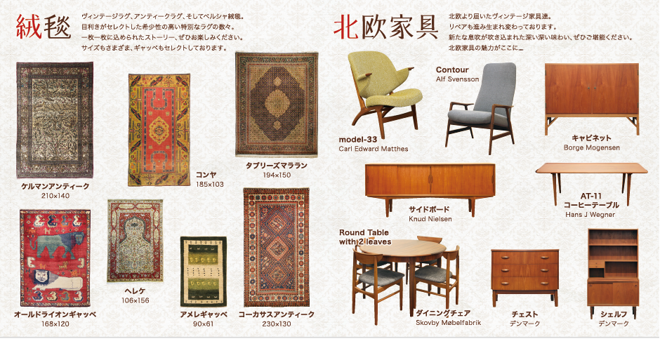 目利きのセレクトした上質なラグの数々、職人が一つ一つ丁寧にリペアしたヴィンテージ家具達、豊富なラインナップでお待ちしております。