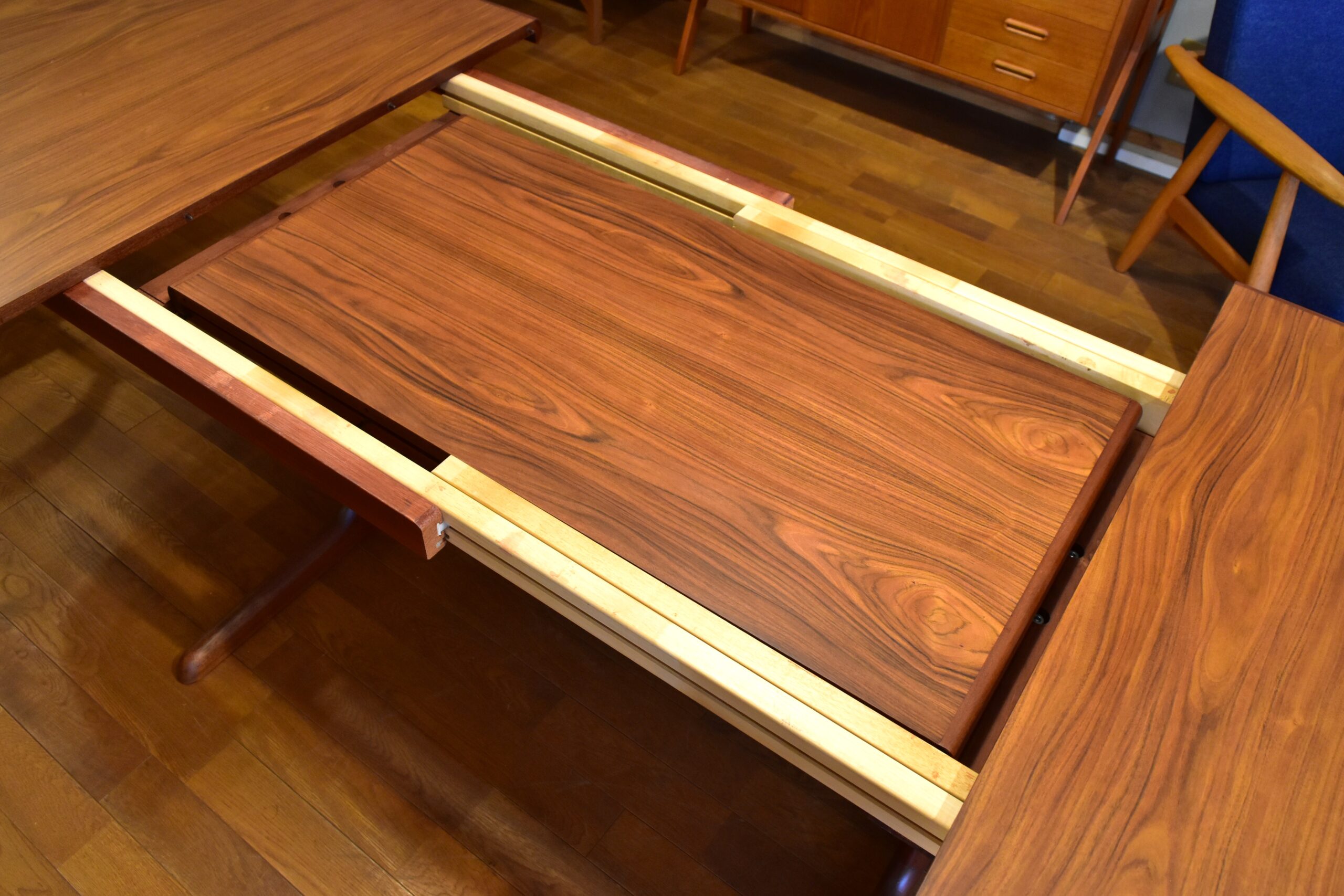 丸でも四角でもない、ユニークな形のSkovby Mobelfabrik社製のエクステンションテーブル。