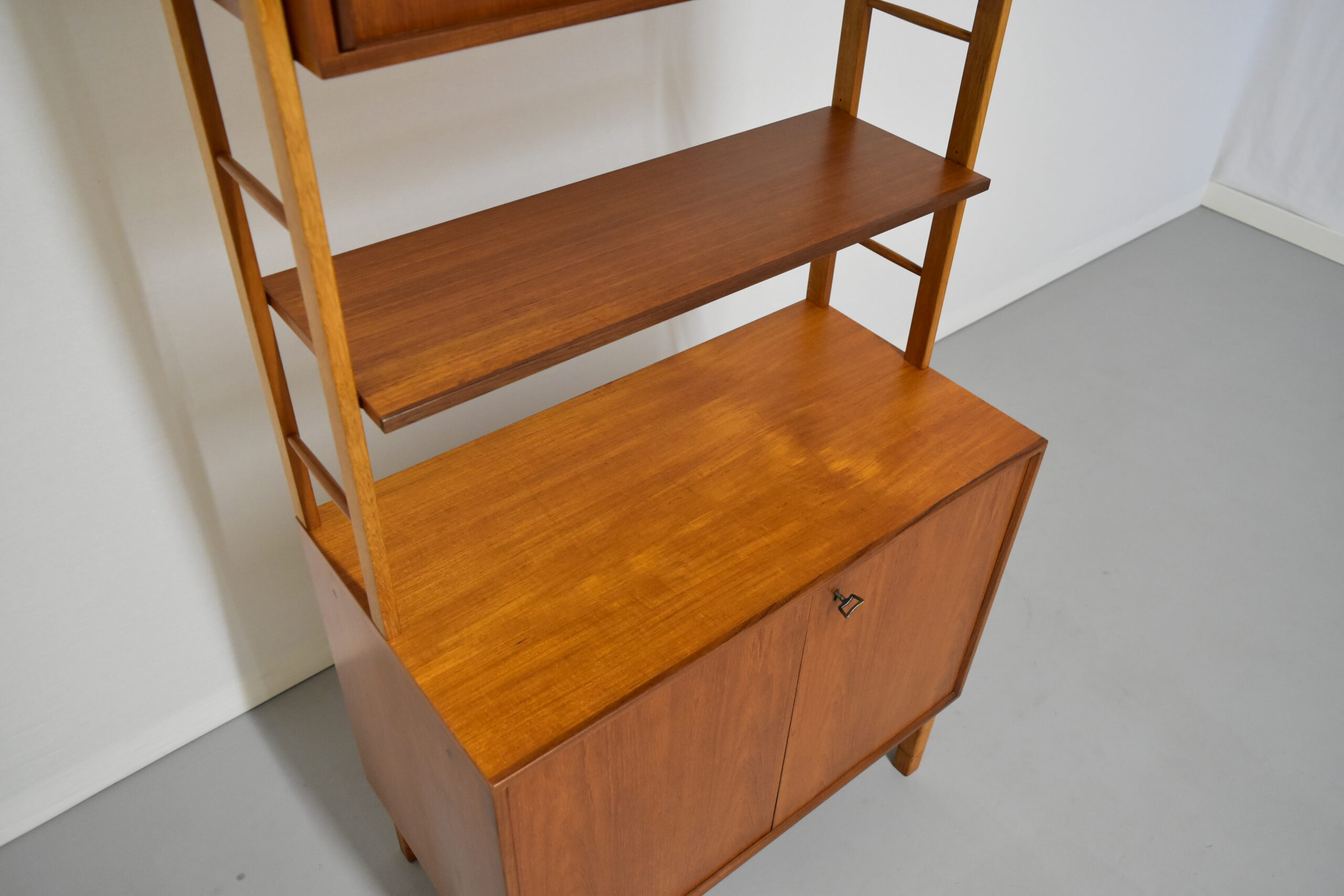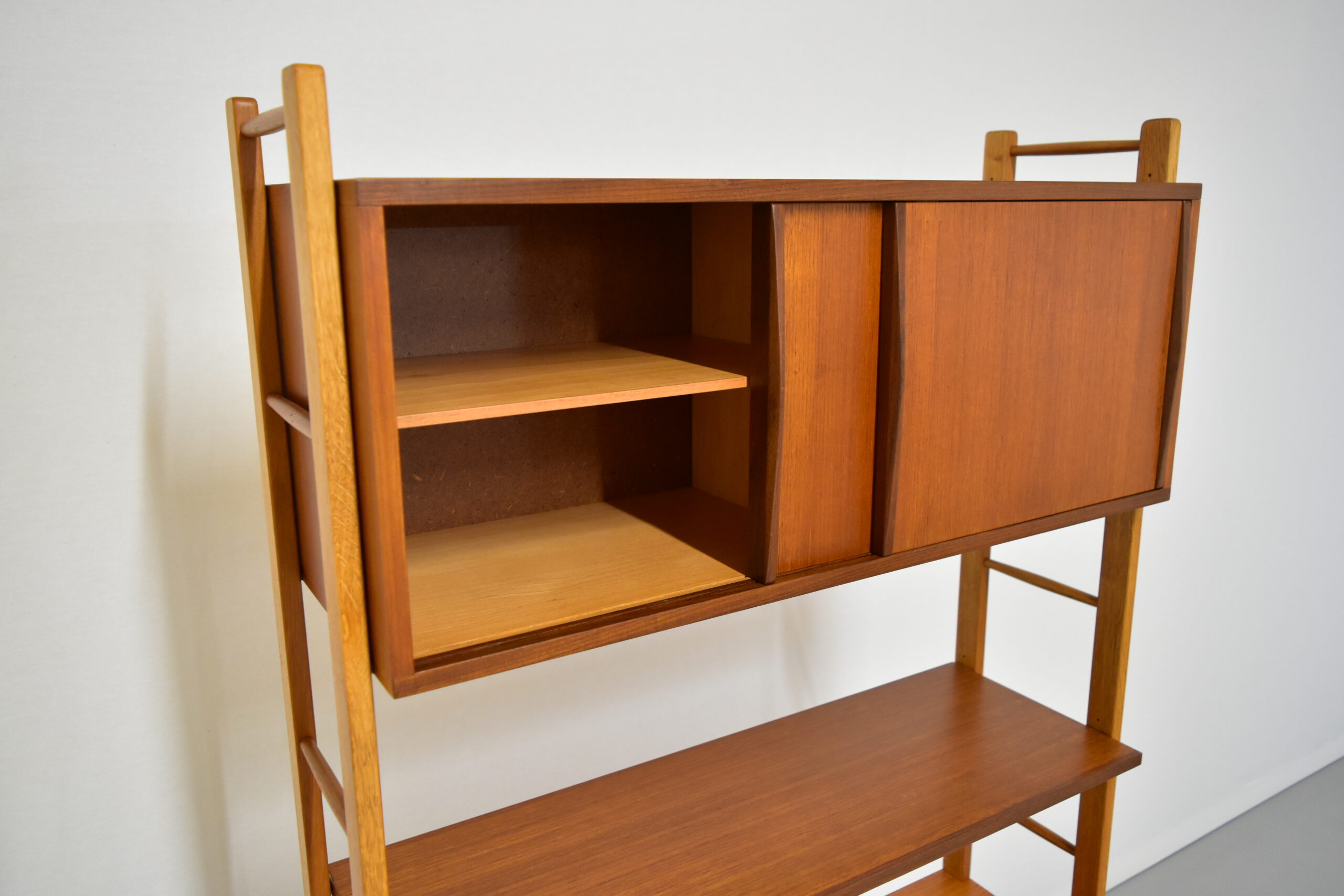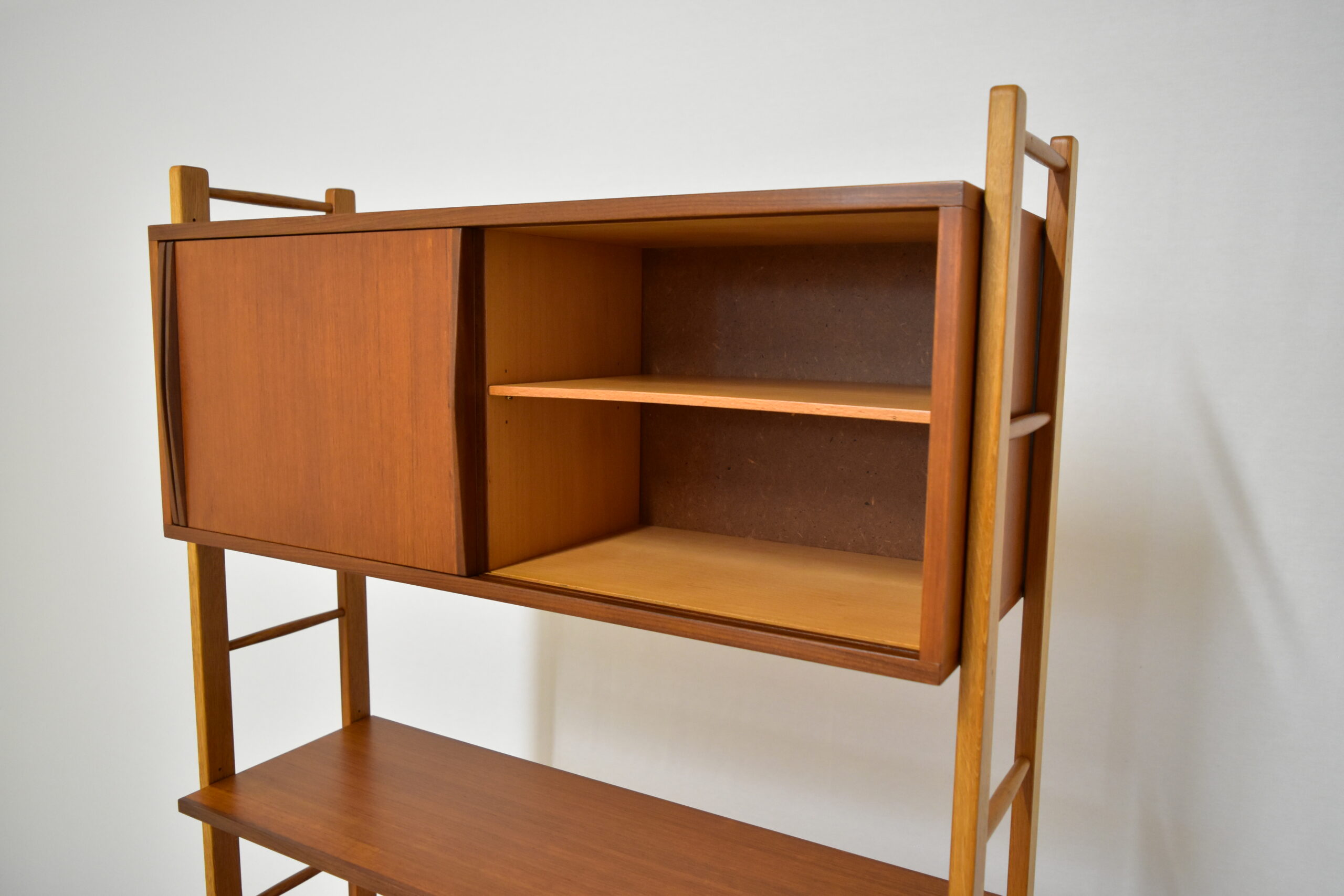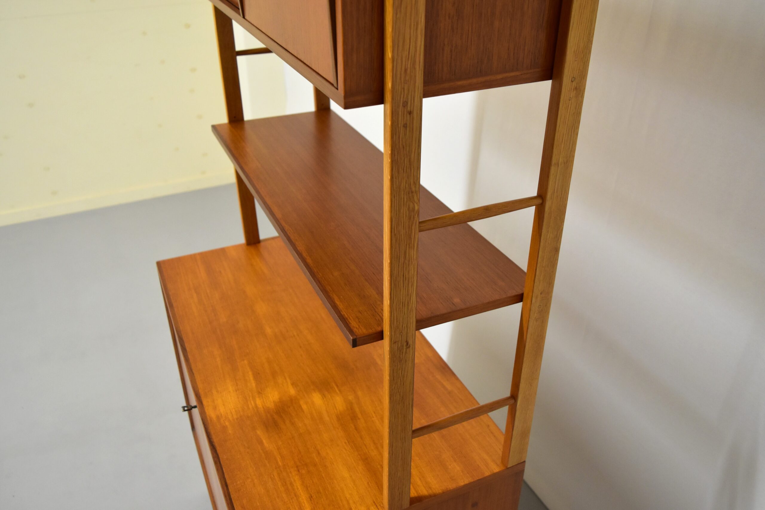 チークとオークの組み合わせもユニークで素敵なシェルフです。